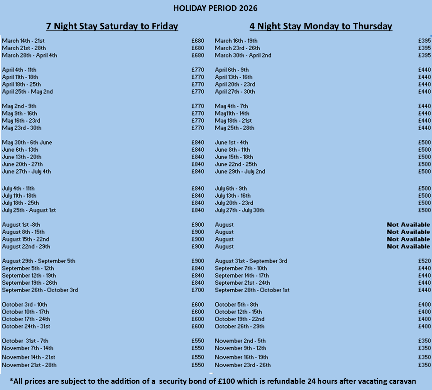 Only one well behaved and friendly dog is allowed in the caravan and should not be allowed to lie on beds or furniture at any time. Please note that there will be a supplemental charge - call to verify prior to booking.